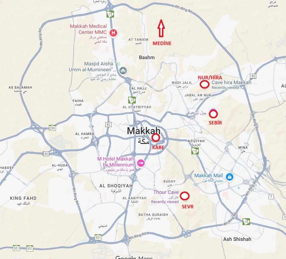 Kabe, Hira (Nur), Sebir ve Sevr Dağları ve Medine Yönünü Gösteren Mekke Haritası. 3 dağın Kabeye uzaklığı yaklaşık 5'er km, Hira ile Sebir arası yaklaşık 1,5 km