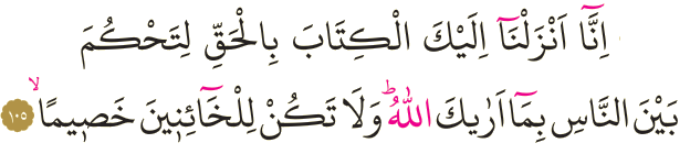 Meali: 105- Allah'ın sana gösterdiği şekilde insanlar arasında hükmedesin diye sana Kitab'ı hak ile indirdik; hainlerden taraf olma!