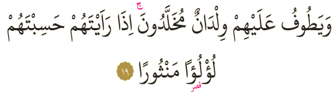 Meali: 19- O insanların etrafında öyle ölümsüz genç nedîmler dolaşır ki, onları gördüğünde, etrafa saçılıp dağılmış inciler sanırsın.