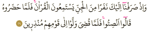 Meali: 29- Hani cinlerden bir gurubu, Kur'an'ı dinlemeleri için sana yöneltmiştik. Kur'an'ı dinlemeye hazır olunca (birbirlerine) "Susun" demişler, Kur'an'ın okunması bitince uyarıcılar olarak kavimlerine dönmüşlerdi.
