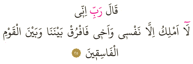 Meali: 25- Musa: "Rabbim! Ben kendimden ve kardeşimden başkasına hakim olamıyorum; bizimle, bu yoldan çıkmış toplumun arasını ayır" dedi.