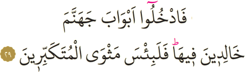 Meali: 29- "O halde, içinde ebedî kalacağınız cehennemin kapılarından girin! Kibirlenenlerin yeri ne kötüdür!"