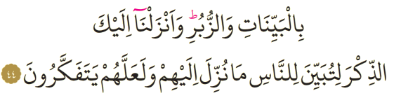 Meali: 44- Apaçık mucizeler ve kitaplarla (gönderildiler). İnsanlara, kendilerine indirileni açıklaman için ve düşünüp anlasınlar diye sana da bu Kur'an'ı indirdik.