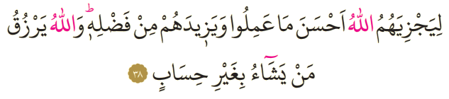 Meali: 38- Çünkü (o günde) Allah, onları yaptıklarının en güzeli ile mükâfatlandıracak ve lütfundan onlara fazlasıyla verecektir. Allah, dilediğini hesapsız rızıklandırır.