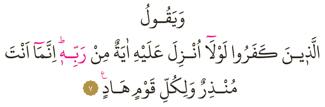 Meali: 7- Kâfirler diyorlar ki: Ona Rabbinden bir mucize indirilseydi ya! (Halbuki) sen ancak bir uyarıcısın ve her toplumun bir rehberi vardır.
