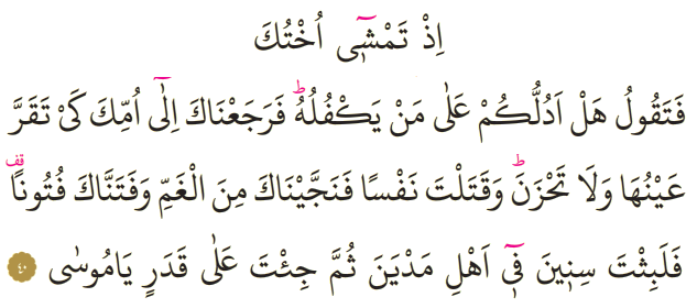 Meali: 40- Hani, kız kardeşin gidip "Ona bakacak birini size bulayım mı?" diyordu. Böylece seni, gözü gönlü mutluluk dolsun ve üzülmesin diye annene geri verdik. Ve sen, birini öldürdün de seni endişeden kurtardık. Seni iyiden iyiye denemeden geçirdik. Bunun için yıllarca Medyen halkı arasında kaldın. Sonra takdire göre (bu makama) geldin ey Musa!