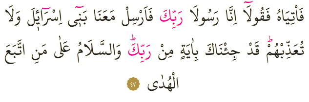 Meali: 47- Haydi, ona gidin de deyin ki: Biz, senin Rabbinin elçileriyiz. İsrailoğullarını hemen bizimle birlikte gönder; onlara eziyet etme! Biz, senin Rabbinden bir âyet getirdik. Kurtuluş, hidayete uyanlarındır.