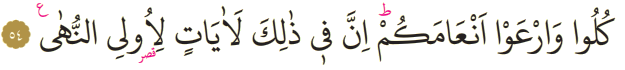 Meali: 54- Yeyiniz; hayvanlarınızı otlatınız. Şüphesiz bunda akıl sahipleri için (Allah'ın kudretine) işaretler vardır.