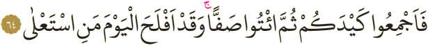 Meali: 64- "Öyle ise hilenizi kurun; sonra sıra halinde gelin! Muhakkak ki bugün, üstün gelen kazanmıştır."