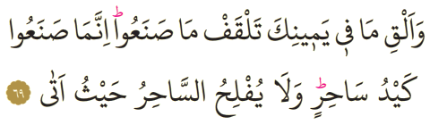 Meali: 69- "Sağ elindekini at da, onların yaptıklarını yutsun. Yaptıkları, sadece bir büyücü hilesidir. Büyücü ise, nereye varsa (ne yapsa) iflah olmaz."