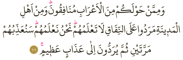Meali: 101- Çevrenizdeki bedevî Araplardan ve Medine halkından birtakım münafıklar vardır ki, münafıklıkta maharet kazanmışlardır. Sen onları bilmezsin, biz biliriz onları. Onlara iki kez azap edeceğiz, sonra da onlar büyük bir azaba itileceklerdir.