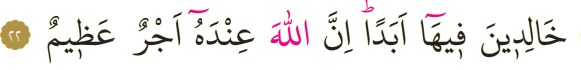 Meali: 22- Onlar orada ebedî kalacaklardır. Şüphesiz ki Allah katında büyük mükâfat vardır.