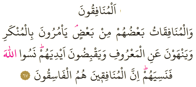 Meali: 67- Münafık erkekler ve münafık kadınlar (sizden değil), birbirlerindendir. Onlar kötülüğü emreder, iyilikten alıkor ve cimrilik ederler. Onlar Allah'ı unuttular. Allah da onları unuttu! Çünkü münafıklar fâsıkların kendileridir.