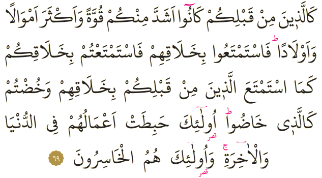 Meali: 69- (Ey münafıklar! Siz de) sizden öncekiler gibi (yaptınız). Onlar sizden kuvvetçe daha üstün, mal ve evlâtça daha çok idiler. Onlar (dünya malından) paylarına düşenden faydalandılar. İşte sizden öncekiler nasıl paylarına düşenden faydalandıysalar, siz de payınıza düşenden faydalandınız ve (bâtıla) dalanlar gibi siz de daldınız. İşte onların amelleri dünyada da ahirette de boşa gitmiştir. Ve onlar ziyana uğrayanların kendileridir.