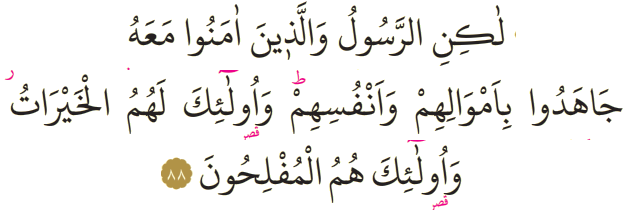 Meali: 88- Fakat Peygamber ve onunla beraber inananlar, mallarıyla, canlarıyla cihad ettiler. İşte bütün hayırlar onlarındır ve onlar kurtuluşa erenlerin kendileridir.