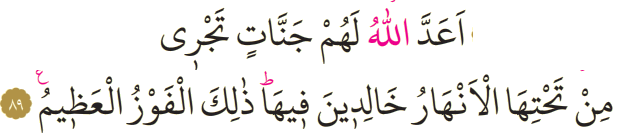 Meali: 89- Allah, onlara içinde ebedî kalacakları ve zemininden ırmaklar akan cennetler hazırlamıştır. İşte büyük kazanç budur.